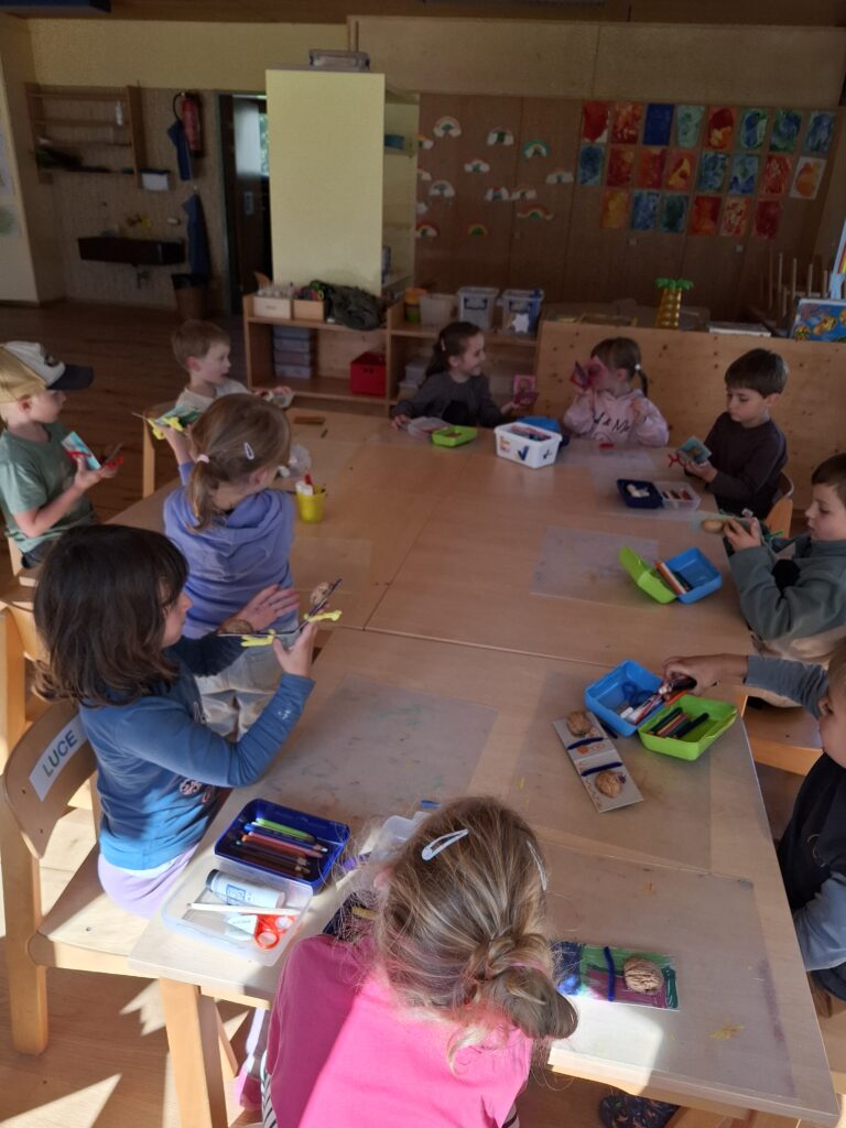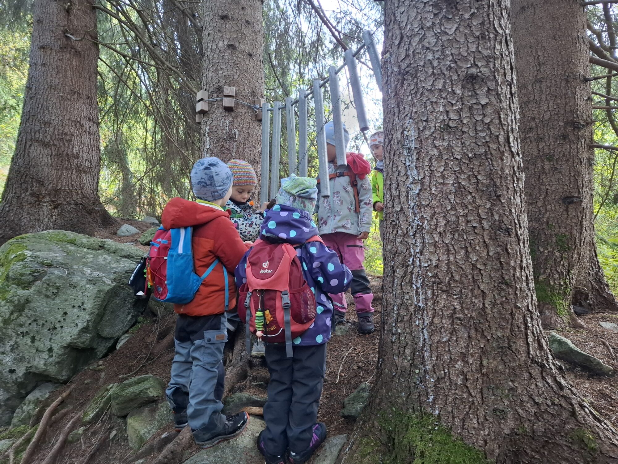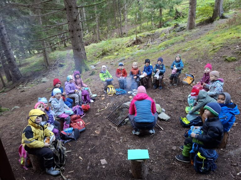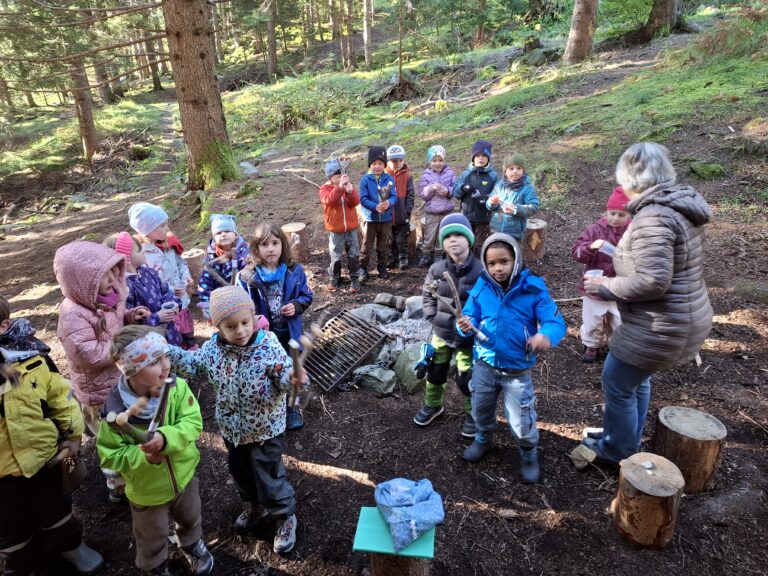 Heute hatten wir einen erlebnissreichen Tag: Wi sind den Zwergaweg gelaufen, haben die Feuerstelle beim Znüniessen in Betrieb genommen und danach haben wir uns musikalisch und handwerklich ausgetobt.